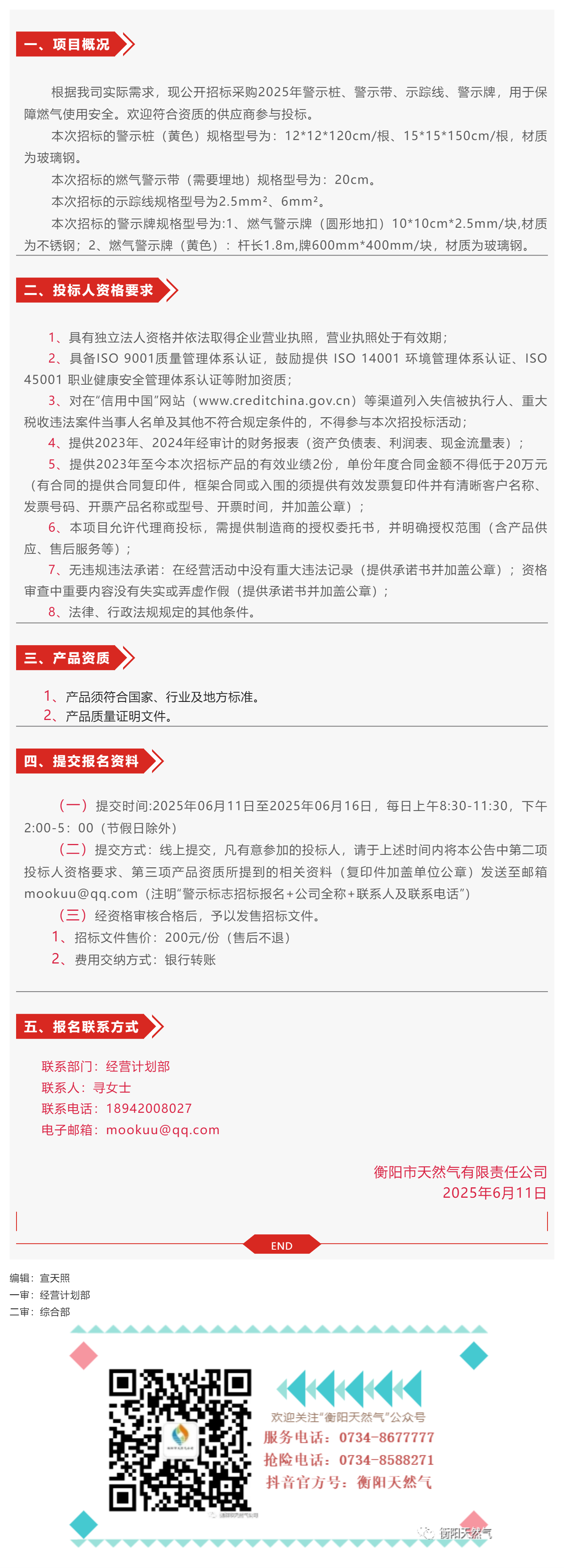 招標公告丨衡陽市天然氣有限責任公司2025年警示樁、警示帶、示蹤線、警示牌采購入圍招標公告